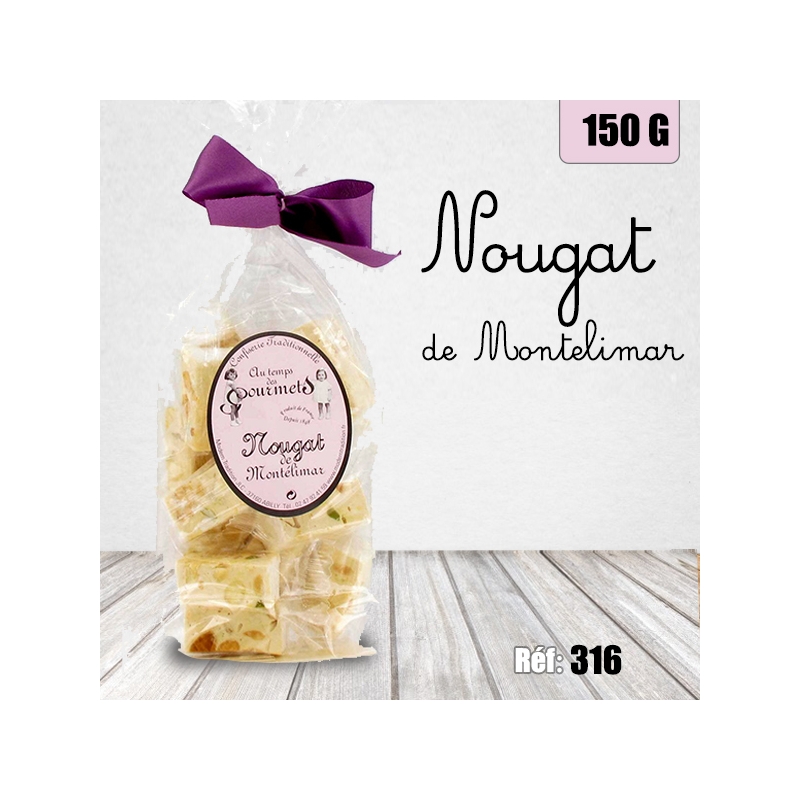 Ingrédients : Amandes 28 %,miel 19 %, sirop de glucose, pistaches 2 %, pain azyme (fécule de pomme de terre, eau, huile d'olive), albumine d'œuf, arôme naturel de vanille.