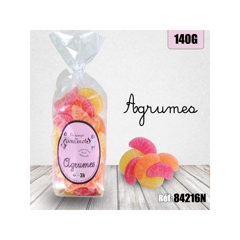Ingrédients : saccharose, sirop de glucose de blé, acide citrique, arômes naturels de citron et d'orange, arômes naturels : extrait de paprika (E160c), curcumine(E100).